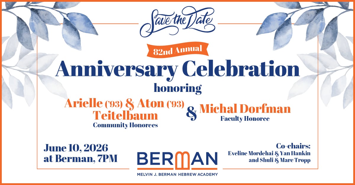 We are looking forward to celebrating with you at our anniversary celebration at 7 pm on June 10, 2025. We will be honoring Deena and Benny Berkowitz, Rabbi Uri (’96) and Dahlia Topolosky, and Bill Blankson.