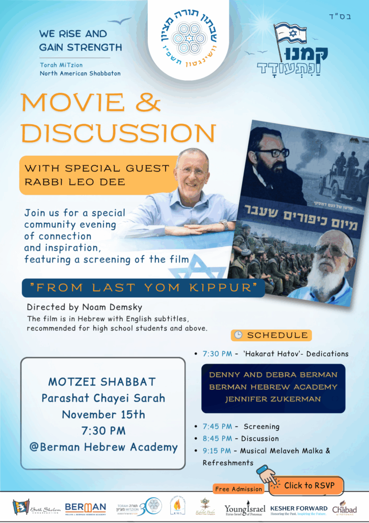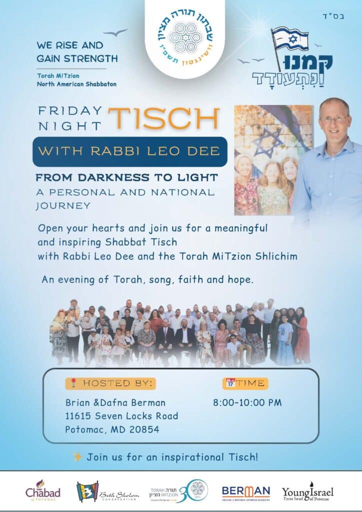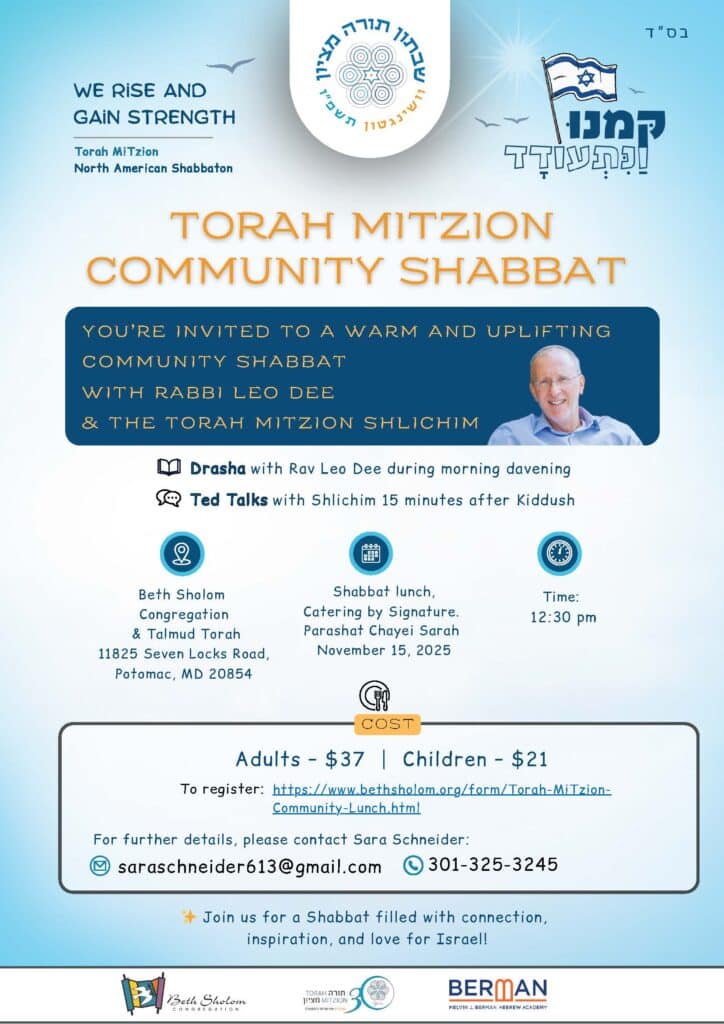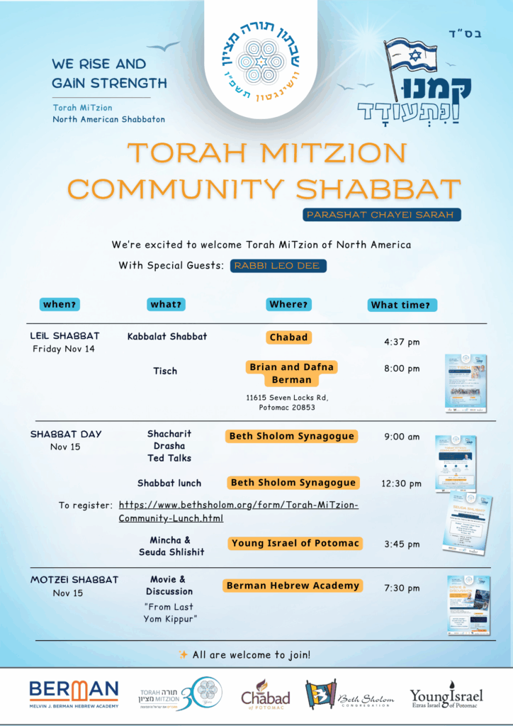 Starting on Wednesday, November 12 with a special Mishmar, through special events on Thursday afternoon, Shabbat in Potomac, and Motzei Shabbat–all with Torah Mitzion families and Rabbi Leo Dee–we are looking forward to a meaningful, moving, and multi-faceted opportunity to both learn with and from a movement on a mission.